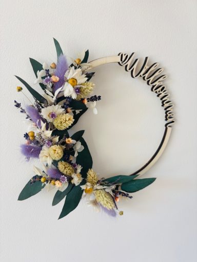 - Ihr könnt aus ganz vielen verschiedenen Trockenblumen und Kranzrohlingen wählen und nehmt dann jeder sein Unikat mit nach Hause.